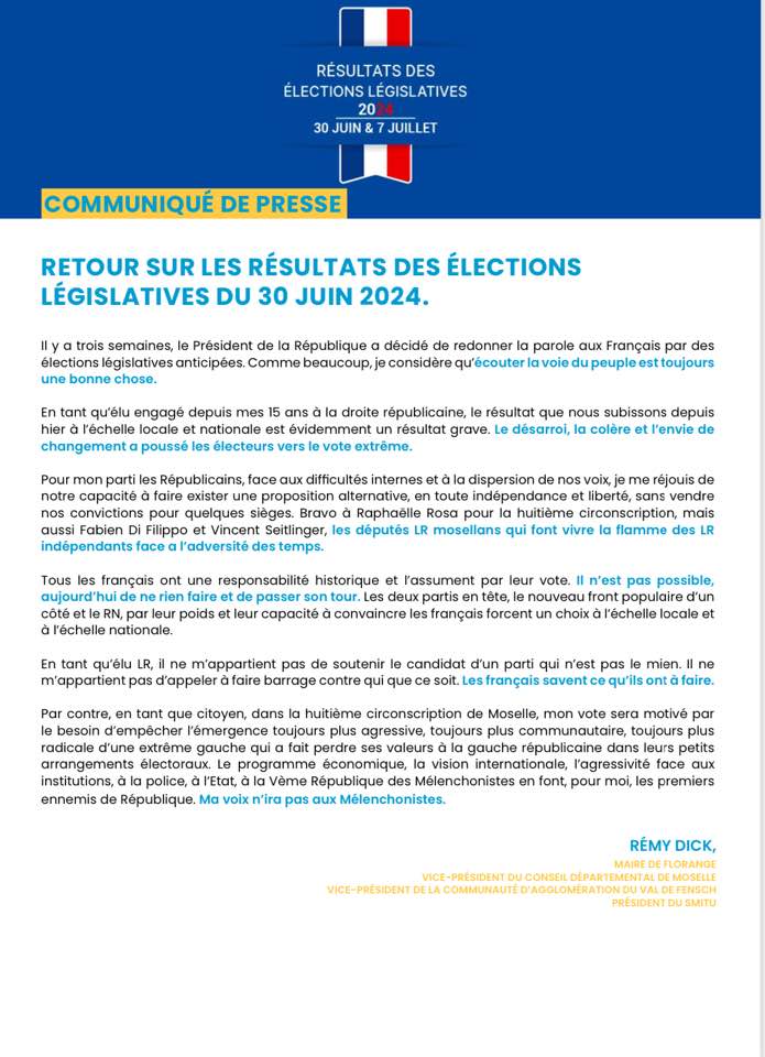 Après le premier tour des législatives anticipées le 30 juin dernier, plusieurs politiques locaux ont annoncé leurs soutiens aux divers candidats lors du second tour. Si Rémy Dick (LR), n’a pas appelé les électeurs à voter pour le candidat RN Laurent Jacobelli dans la 8ème circonscription, où le député sortant sera opposé à Céline Léger le 7 juillet prochain, le maire de Florange et conseiller départemental délégué à la culture annonçait via un communiqué qu’à titre personnel, « sa voix n’ira pas aux Mélenchonistes ».