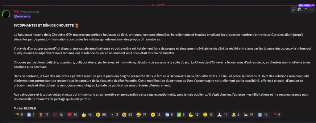 Seulement voilà, dans la communauté des « chouetteurs », nombre d’entre-eux estiment que la « véritable contremarque » enterrée en 1993 par Max Valentin, co-organisateur décédé, serait toujours dans la nature et que la trouvaille du 3 octobre 2024 ne serait pas la contremarque originale. La communauté se divise ainsi entre les daboïstes et les anti-daboïstes, qui réfutent donc la fin de la chasse de la Chouette d’Or. Ce différend aurait donné lieu à « une période houleuse où déni, critiques, rumeurs infondées, harcèlements et insultes émaillent les propos » d’un certain nombre de personne. Dans un communiqué publié sur Discord, l’auteur annonce donc surseoir à la suite du jeu. « La Chouette d’Or reverra le jour sous d’autres cieux, en d’autres mains, offerte à des passions plus positives. » Difficile donc pour l’heure de savoir si cette quête débutera un jour et sous quelle forme…