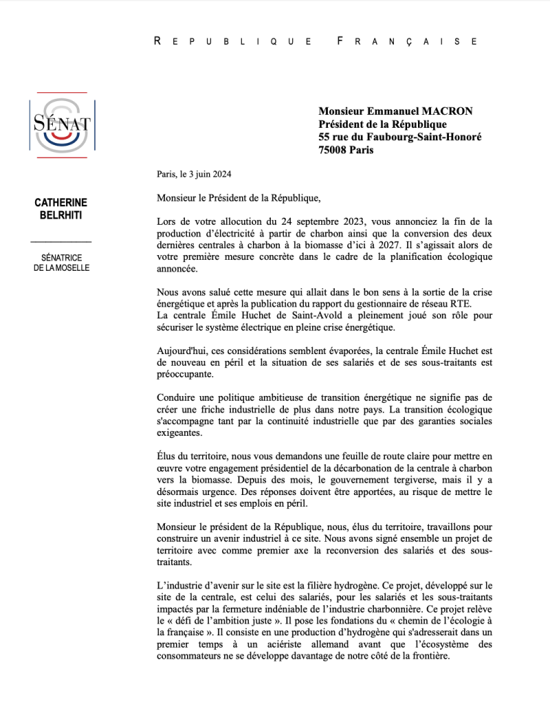 S’ils se sentent abandonnés par Bercy, les grévistes peuvent compter sur le soutien d’élus mosellans. Dans une lettre ouverte et transpartisane, adressée au président de la République et co-signée par 423 élus locaux, la sénatrice Catherine Belrhiti estime que » la centrale Emile Huchet est de nouveau en péril et la situation de ses salariés et de ses sous-traitants est préoccupante (…) Depuis des mois, le gouvernement tergiverse, mais il y a désormais urgence ». Après avoir rencontrer les salariés, elle demande ainsi, « une feuille de route claire pour mettre en œuvre votre engagement présidentiel de la décarbonation de la centrale à charbon vers la biomasse. »