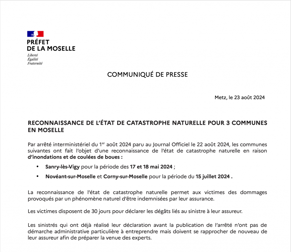 C’est officiel depuis le 22 août dans le Journal Officiel, trois nouvelles communes en Moselle font l’objet d’une reconnaissance de l’état de catastrophe naturelle : Sanry-lès-Vigy après les inondations et coulées de boues du 17 au 18 mai. Ainsi que Novéant-sur-Moselle et Corny-sur-Moselle pour les inondations du 15 juillet dernier. À compter de cet arrêté ministériel, les victimes ont 30 jours pour déclarer les dégâts. Pour les assurés qui avaient déjà entamé les démarches, il suffit de se rapprocher de son assureur pour préparer la venue des experts.