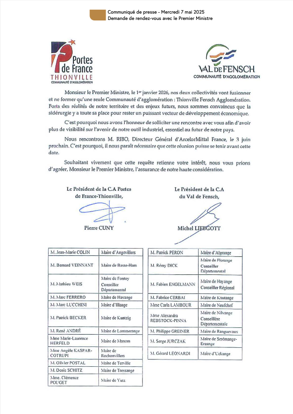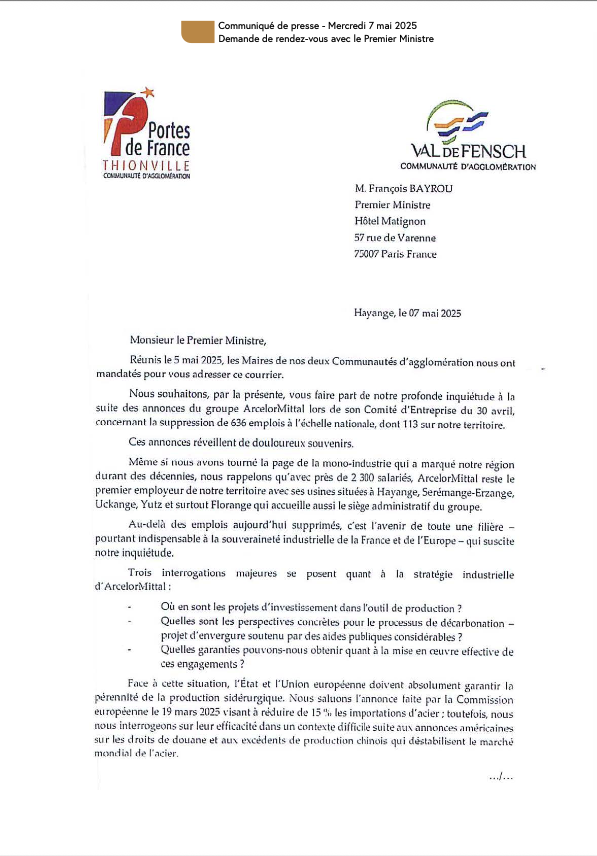 « Ces annonces réveillent de douloureux souvenirs » peut-on lire dans un courrier rédigé par les présidents du Val de Fensch et Portes de France – Thionville et adressé à François Bayrou, Premier ministre. Ils mettent en avant la suppression de plus de 113 postes au sein d’ArcelorMittal Florange.
