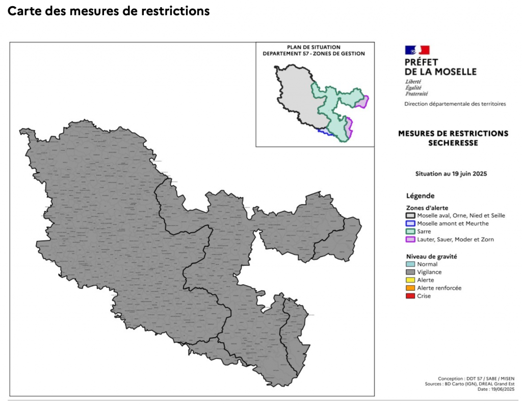 Face à cette situation, le préfet de la Moselle, Pascal Bolot, a décidé de placer l’ensemble du département en situation de vigilance sécheresse, le premier niveau d’alerte du plan sécheresse. Les conditions météorologiques à venir, marquées par la chaleur et l’absence de pluie significative, laissent craindre une aggravation.