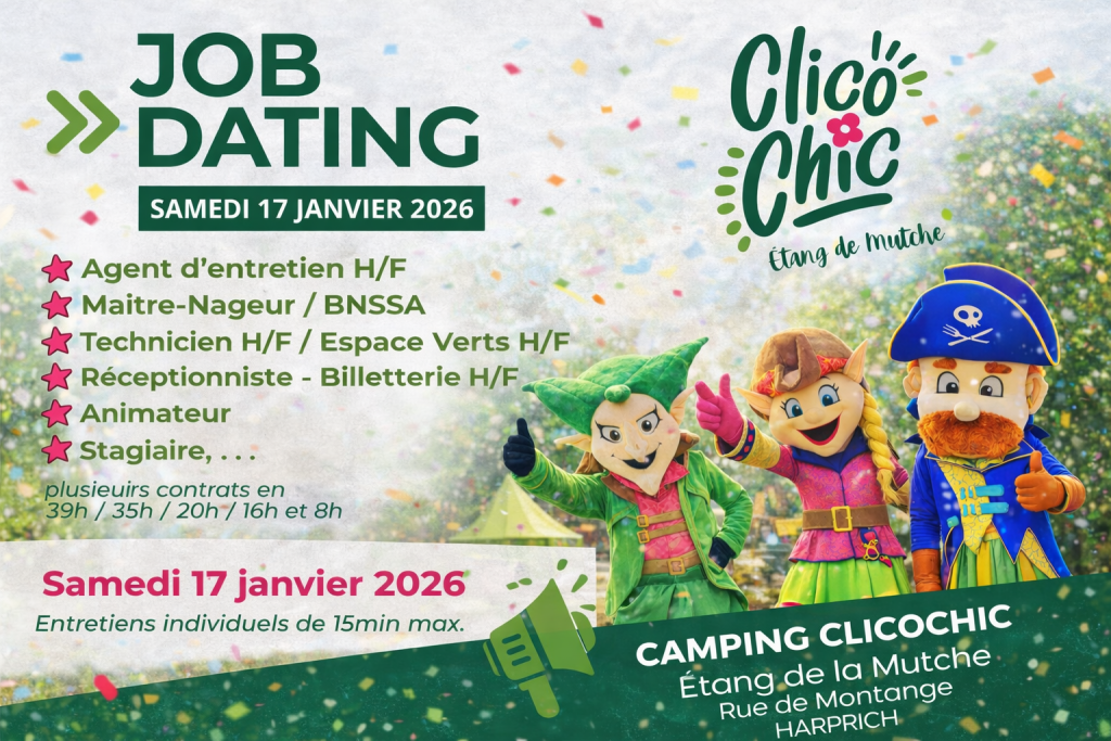 Technicien, agent espaces verts, réceptionniste/billetterie, agent d’entretien, maître-nageur ou BNSSA, surveillant de baignade et animateur… les opportunités seront nombreuses samedi 17 janvier à Harprich. Le Camping de l’Étang de la Mutche prépare un job dating pour compléter ses rangs en vue de l’été 2026. Entre 30 et 40 postes sont à pourvoir dans différents métiers. Des stagiaires sont également recherchés pour des postes d’assistant(e) de direction, réceptionniste ou encore community manager.