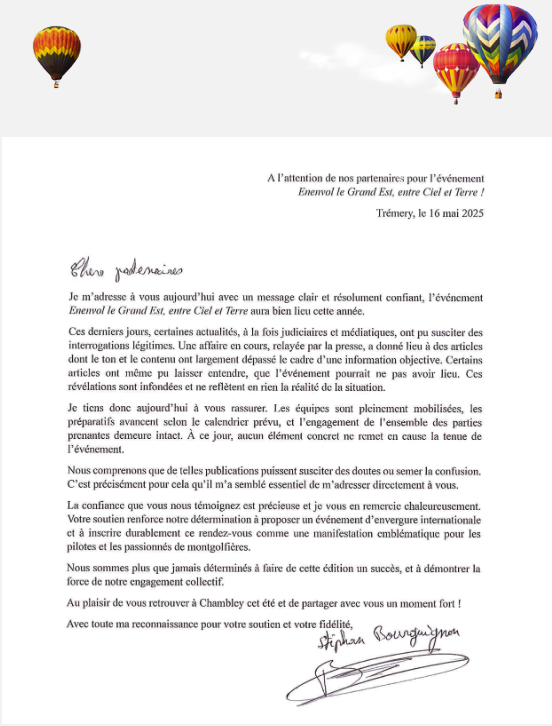 « Je m’adresse à vous aujourd’hui avec un message clair et résolument confiant, l’événement « Enenvol le grand Est, entre Ciel et Terre » aura bien lieu » en 2025. Des propos visibles dans une lettre ouverte aux partenaires et à la presse, rédigée par Stéphane Bourguignon, directeur du groupe ABC.