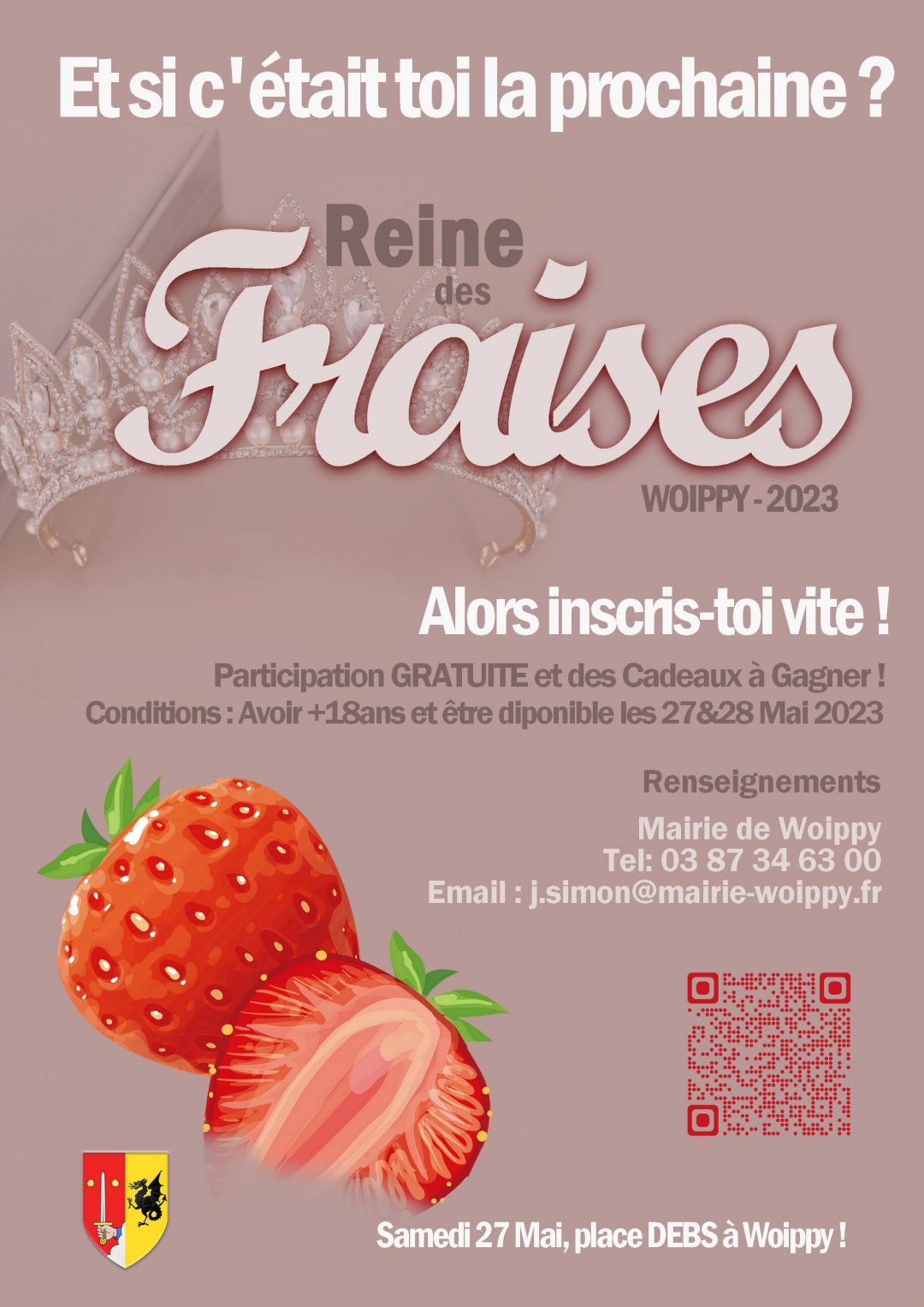 Et si cette année, vous étiez couronnée ? Les inscriptions pour devenir la Reine des Fraises de Woippy sont ouvertes jusqu’au 22 mai. Une tradition qui a vu élire sa première candidate en 1936. Alors pour s’inscrire, rien de plus simple, il suffit de flasher le QR Code qui s’affiche sur votre écran, écrire à l’adresse mail indiquée ou remplir le bulletin en mairie !