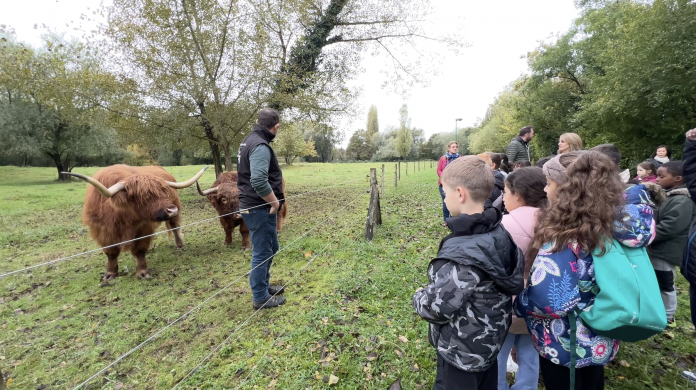 Depuis quelques mois, des vaches Highlands ont pris leur quartier près du plan d’eau… À l’initiative de la Ville de Metz, elles pâturent les espaces verts afin de limiter l’utilisation de matériaux d’entretien thermique. Cette initiative d’éco-pâturage, les enfants de l’école Louis Pergaud, à Borny, ont pu la découvrir à l’occasion d’une sortie proposée par la Ville.