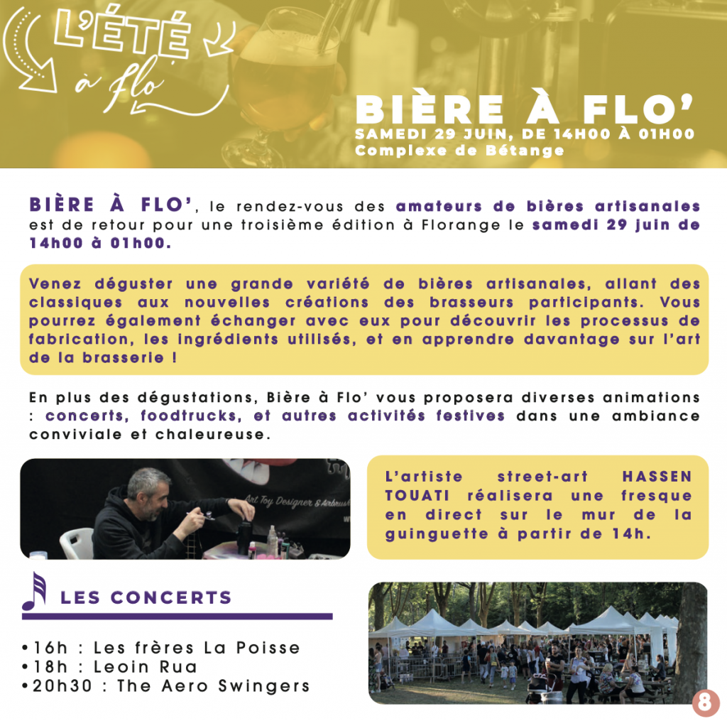 Le samedi 29 juin, les amateurs de bières artisanales ont rendez-vous pour la troisième édition de Bière à Flo’. Au programme : dégustations de blondes artisanales, allant des classiques aux nouvelles créations des brasseurs participants. En plus des dégustations, diverses animations sont prévues : concerts, foodtrucks et autres activités festives. L’artiste street-art Hassen Touati réalisera une fresque en direct sur le mur de la guinguette à partir de 14h.