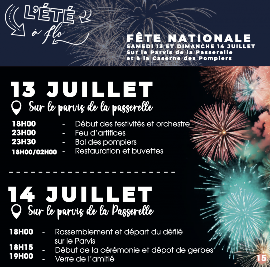 Les 13 et 14 juillet, c’est la fête nationale ! Au programme : feu d’artifice, bal des pompiers, rassemblement et départ du défilé sur le parvis.