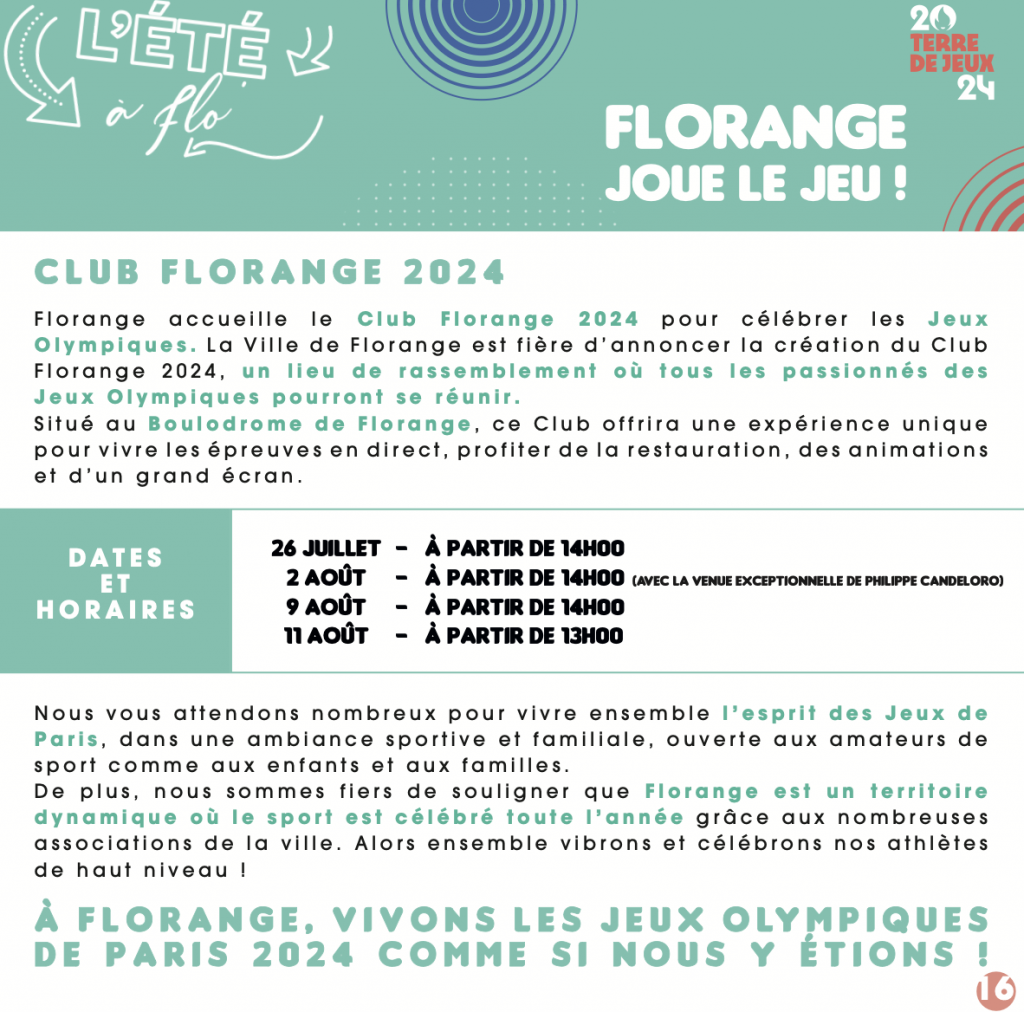 Qui dit été 2024, dit Jeux olympiques. À cette occasion, le club Florange est fier d’annoncer la création du Club Florange 2024 : un lieu où tous les passionnés des Jeux pourront se réunir dans une ambiance sportive et familiale.