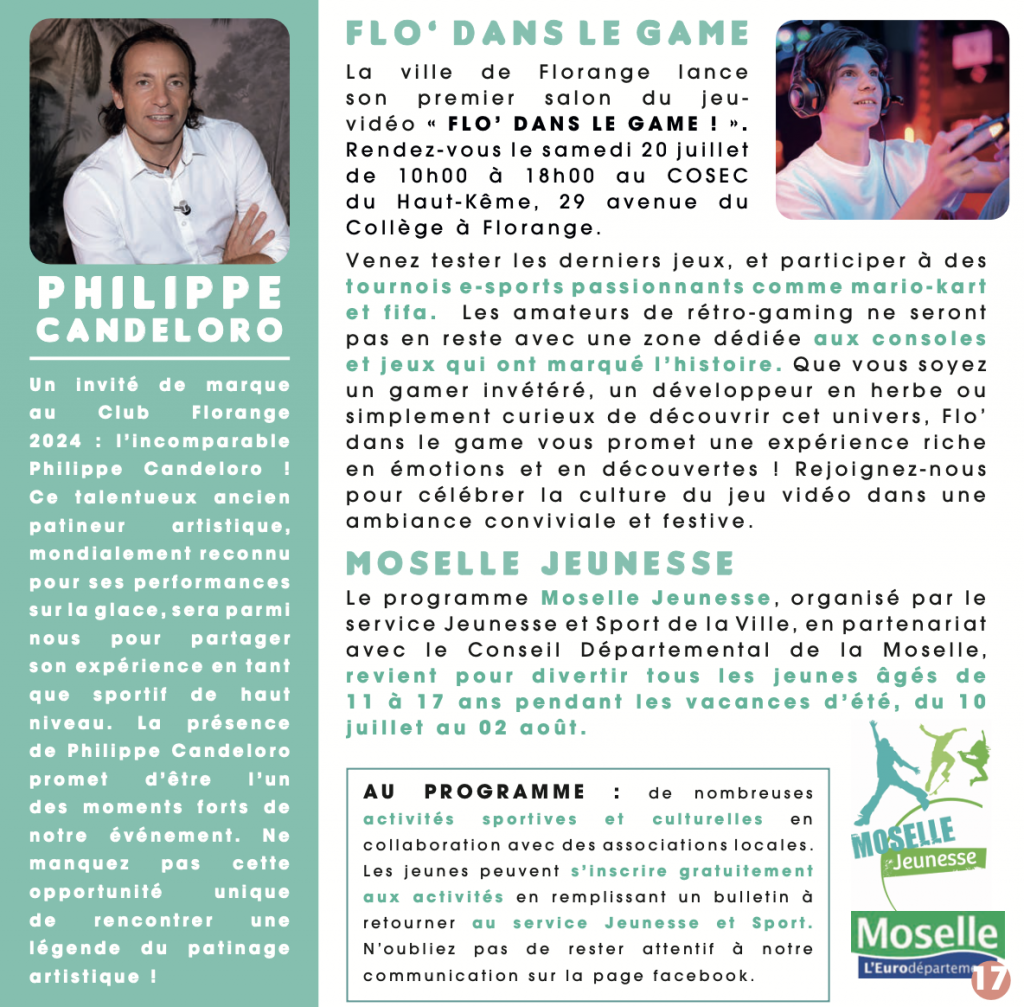 Vous êtes passionné par les jeux vidéo ? la ville lance son premier salon du jeu-vidéo « Flo’ dans le game ! » le 20 juillet. Mario-kart, fifa… les amateurs de rétro-gaming ne seront pas en reste avec une zone dédiée aux consoles et jeux qui ont marqué l’histoire.