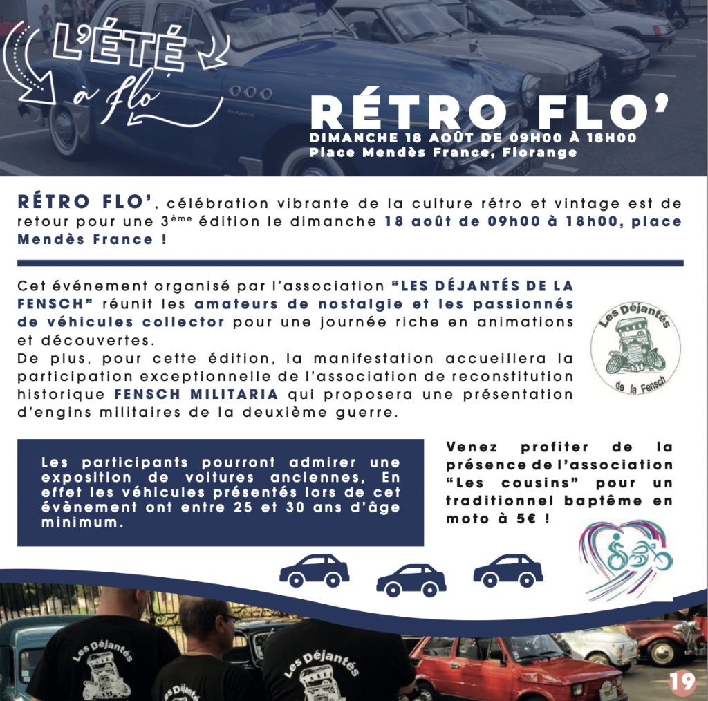 Le 28 juillet, plongez dans la nostalgie avec Rétro Flo’. Organisée par « Les Déjantés de la Fensch », cette troisième édition réunit passionnés de véhicules collectors et amateurs de nostalgie autour d’une exposition de voitures anciennes datant de 25 à 30 ans.