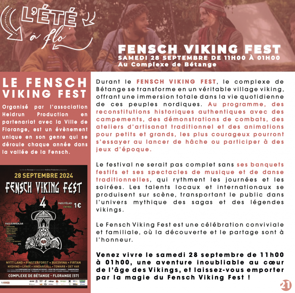 Le 28 septembre, le complexe de Bétange se transforme en village viking pour le Fensch Viking Fest. Découvrez des reconstitutions historiques, des démonstrations de combats, des ateliers d’artisanat traditionnel et des animations pour toute la famille. Les plus audacieux pourront même s’essayer au lancer de hache ou participer à des jeux d’époque.
