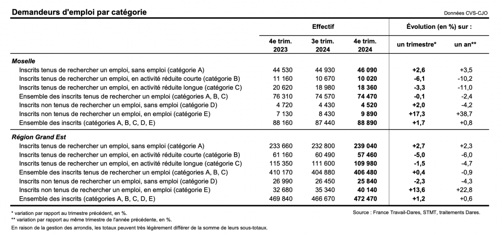 Au 4e trimestre 2024, France Travail comptait une hausse des demandeurs d’emploi (catégorie A) dans le Grand Est (+2,7%) mais aussi en Moselle (+2,6%).