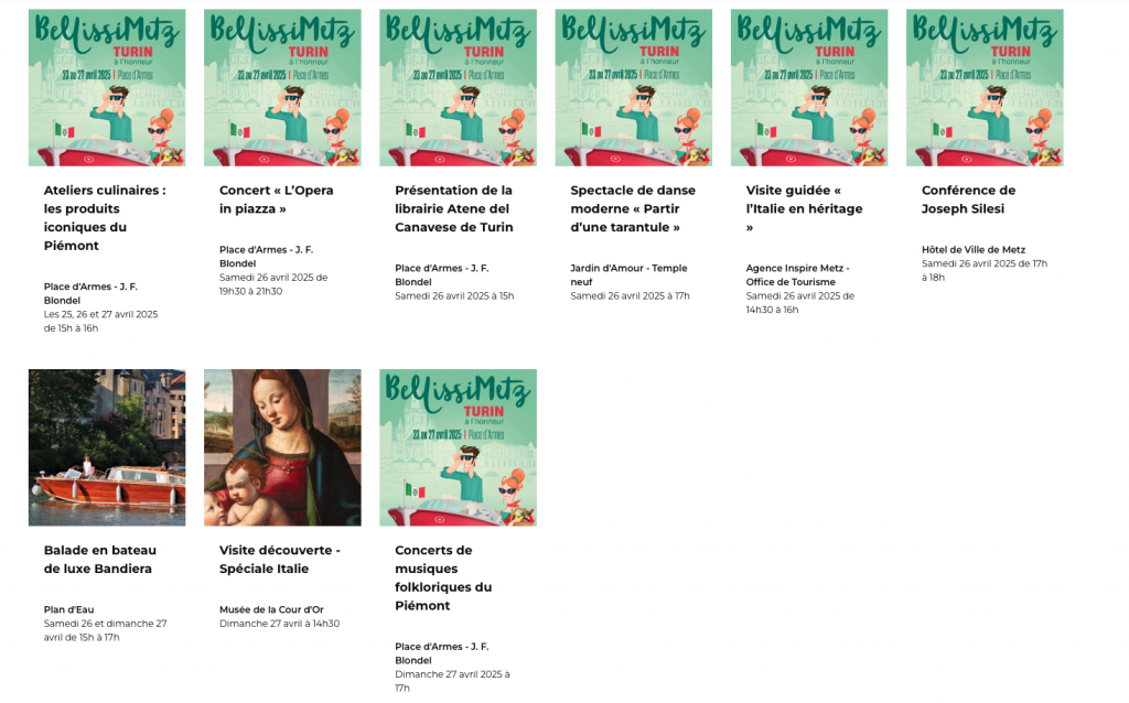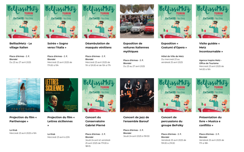 Outre la présence de gourmandises sucrées et salées, bijoux et articles maroquinerie, la culture est aussi mise à l’honneur par la Ville de Metz. Au programme cette année : une exposition de costumes à l’hôtel de ville, des projections de films italien en VO au Klub, divers concert italiens ou encore des conférences et ateliers culinaires… De quoi faire planer un air de dolce vita sur la capitale mosellane jusqu’au dimanche 27 avril. Tout le programme de BellissiMetz est à retrouver en cliquant ici.