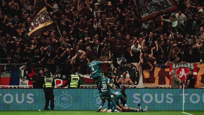 Mais c’est à nouveau Matthieu Udol qui faisait exploser le kop messin. Après une course rapide pour récupérer la balle côté gauche, le capitaine envoyait le ballon sur Gauthier Hein à droite. Le Thionvillois se replaçait dans l’axe et offrait une tallonnade à Alpha Touré en embuscade qui plaçait sa balle au ras du poteau droit (1-2, 112e). Un premier but en pro pour le jeune joueur de Génération Foot arrivé à l’été dernier. Enfin, Gauthier Hein venait crucifier les Rémois avec un tir presque du milieu de terrain (114e) qui lobait le gardien trop avancé (1-3). Au terme d’un match fou, au bout de la nuit, le FC Metz décrochait sa place pour la Ligue 1, un an après l’avoir quitté.