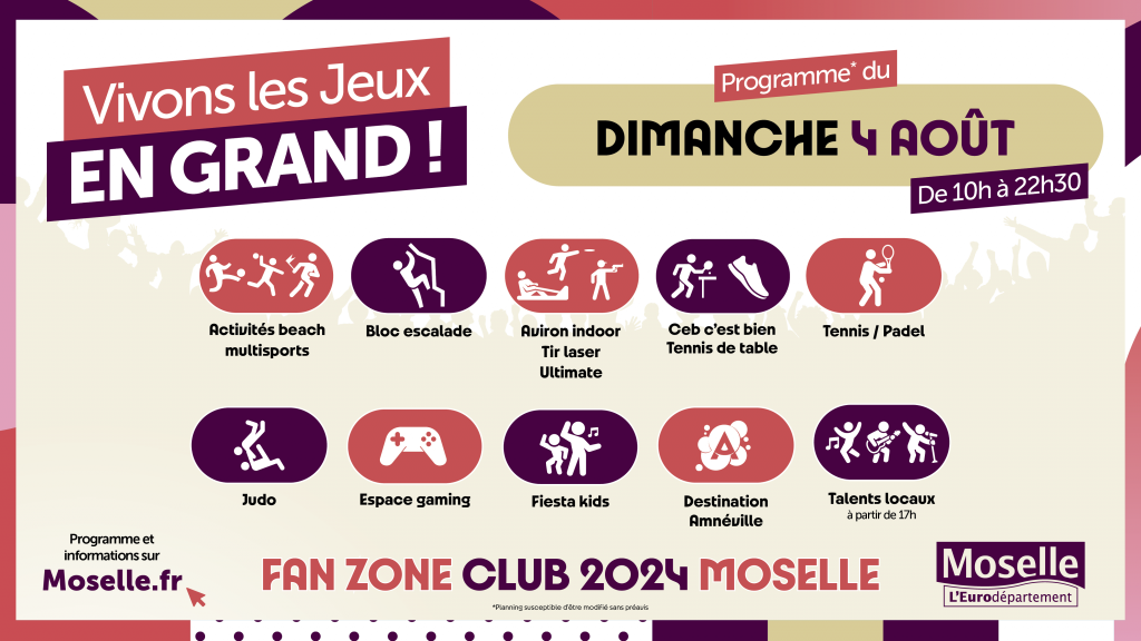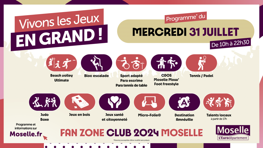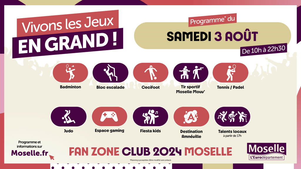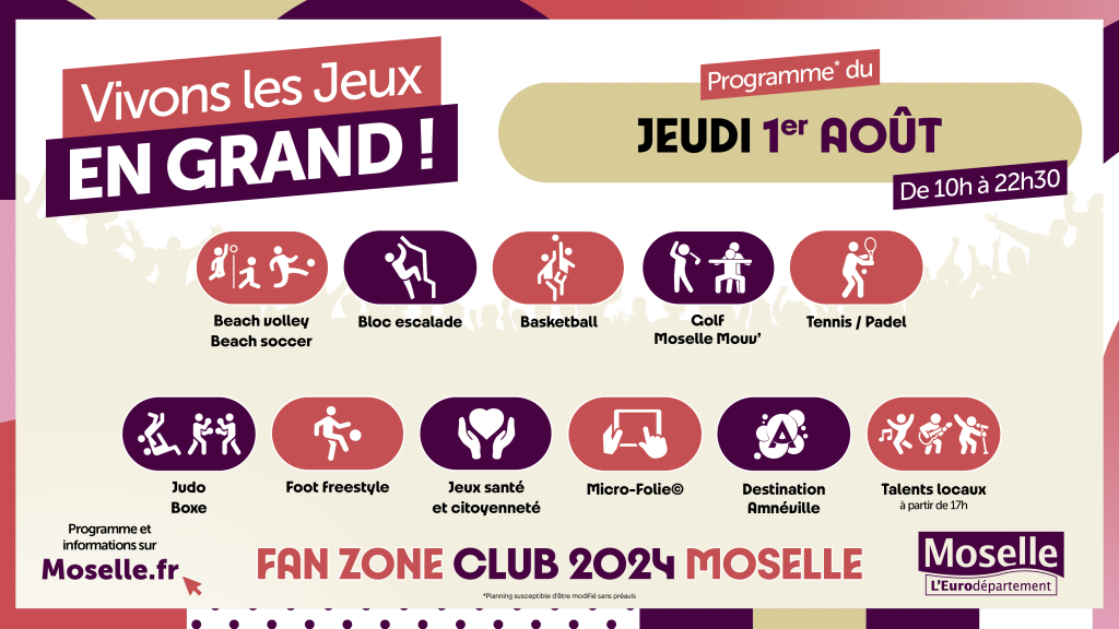 Chaque jour et jusqu’au 8 septembre, vous pourrez retrouver le programme des animations au coeur de la Fan Zone départementale à Amnéville, dans le cadre des Jeux Olympiques Paris 2024.